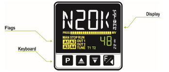 βAfter the electrical installation has been completed (see SETUP) and the unit has been turned on, the controller will display the software version number for 2-3 seconds, followed by the Indication Screen. The Indication Screen will show the PV (Process Variable) and SP (Setpoint) values in addition to flags that notify specific conditions of the controller and monitored processes. After that, it will display the Indication Screen. It shows the PV (Process Variable) and SP (Setpoint) values and flags that inform specific conditions of the controller and monitored process. Controller front panel and basic display information shown below.