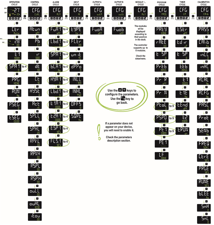 The configuration parameters have been gathered into affinity groups, called Cycles. As shown in the figure below, there is the Operation Cycle and the Configuration Cycles, composed of Control, Alarms, Input, Output A, Output B, Modules (1 to 8), Programs, Timer, and Calibration: