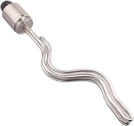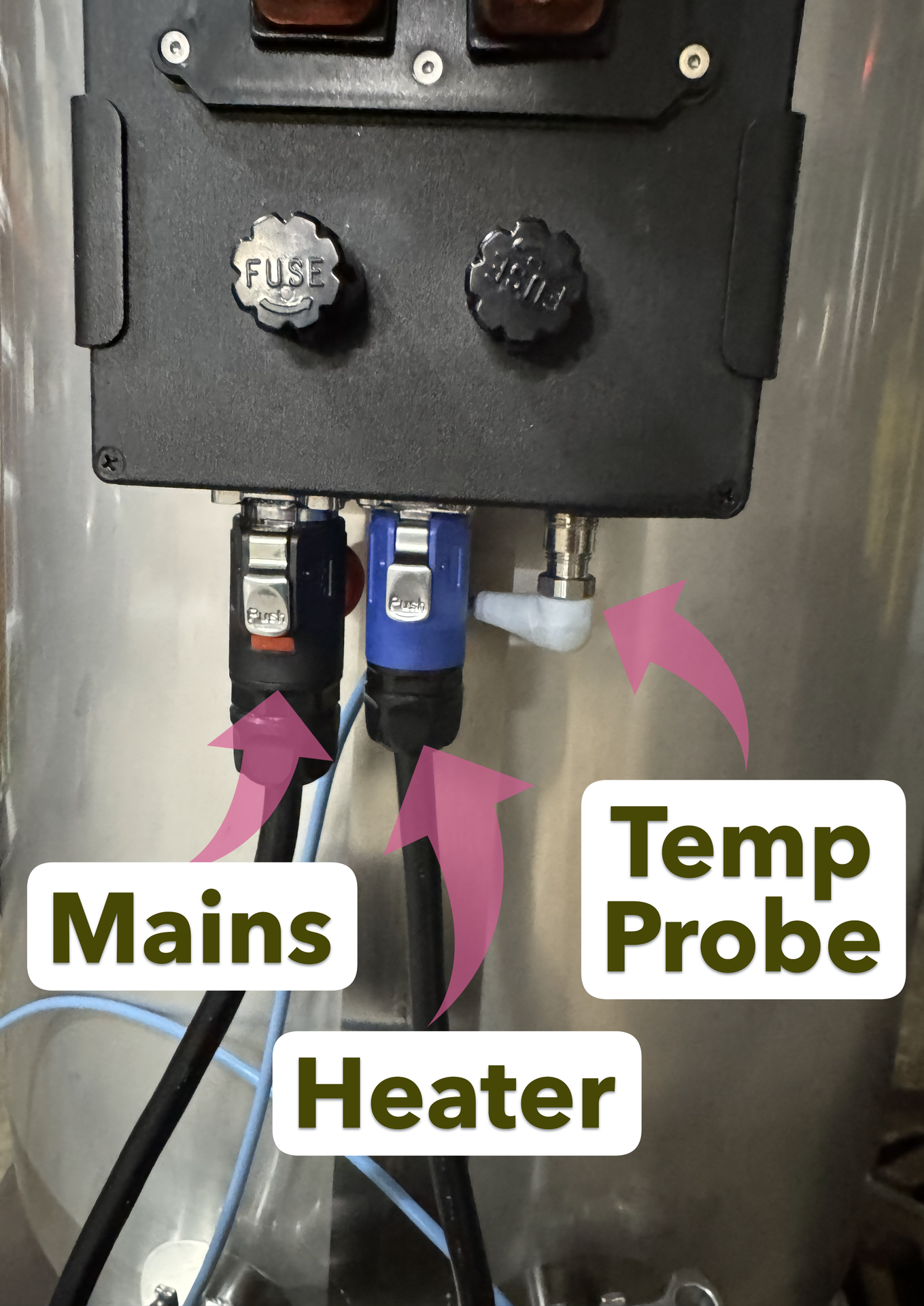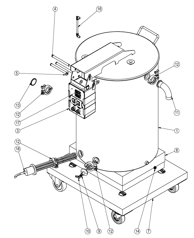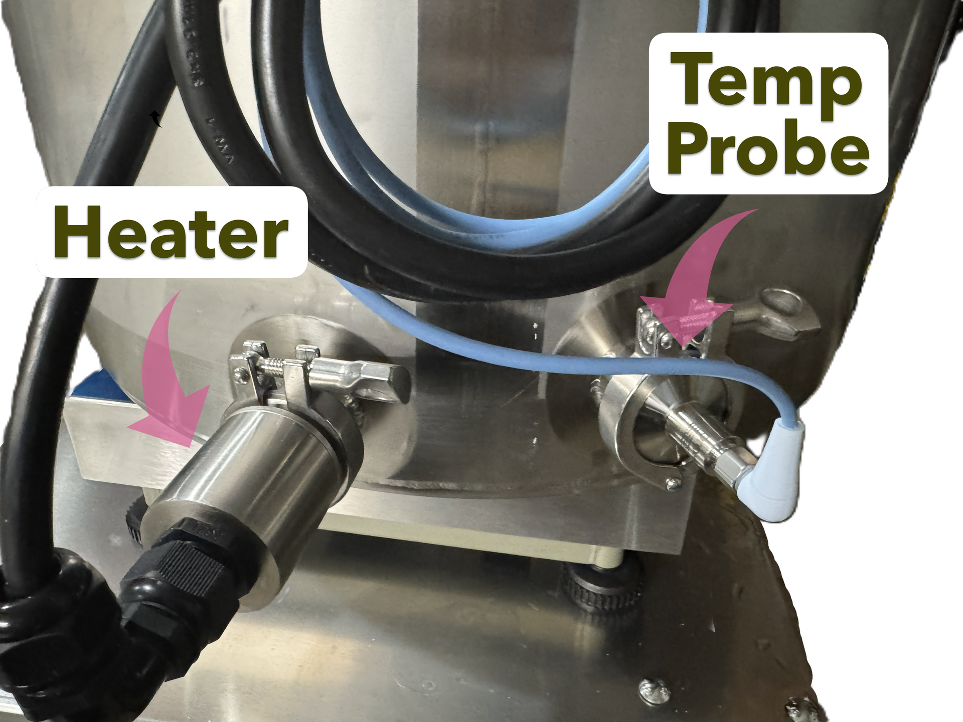 Insert the heating element (18) and temperature probe (9) into the appropriate fittings. The heater should be in the lower fitting, and the temperature probe should be slightly higher (as shown). Both should be secured with a tri-clamp fitting (12) as shown.