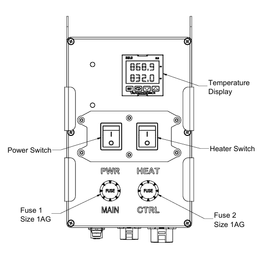 There are two switches for operation, βPowerβ and βHeatβ. The main βPowerβ switch controls the power for the entire system. Always turn off the power switch when connecting or disconnecting the controller from the main power source or for service and maintenance. The switch will be illuminated red when power is enabled to the controller.